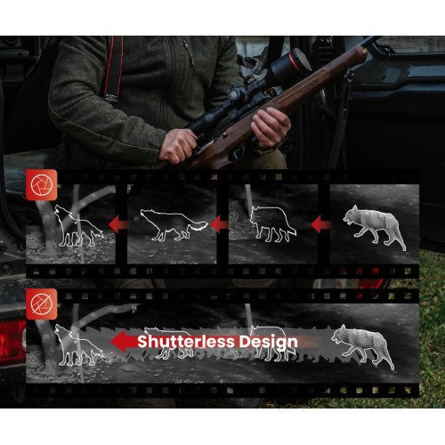 Innowacyjna technologia migawki 3.0 eliminuje dźwięk kliknięcia i zatrzymywanie obrazu, zapewniając nieprzerwany obraz w czasie rzeczywistym podczas polowań, na wypadek gdyby jakiekolwiek strzały zostały zgubione lub pominięte podczas kalibracji.