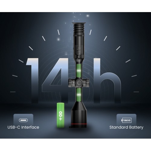 Dwa wbudowane akumulatory i zewnętrzny system zasilania zapewniają solidne zasilanie awaryjne podczas dłuższych sesji polowań, trwających do 14 godzin. Co więcej, wymienne standardowe akumulatory 18650 obsługują funkcję wymiany „na gorąco”, co pozwala na praktycznie nieograniczony czas pracy.