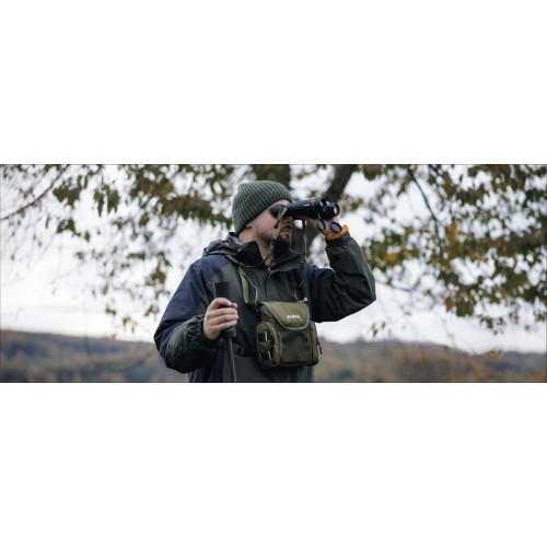 W zestawie znajduje się praktyczny pokrowiec oraz unikalna uprząż piersiowa Pixfra, która zapewnia wygodne i bezpieczne przenoszenie lornetki Draco w terenie. Uprząż wyposażona jest w specjalny pasek zabezpieczający, utrzymujący lornetkę stabilnie zawieszoną i zapobiegający jej upadkowi na ziemię nawet w przypadku puszczenia urządzenia. Uprząż może być używana bezpośrednio z lornetką, bez konieczności korzystania z pokrowca, co znacząco zwiększa komfort i bezpieczeństwo użytkowania w każdych warunkach terenowych.